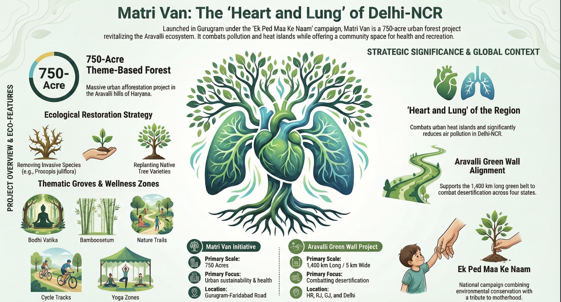 The ‘Matri Van’ initiative represents a pivotal strategic intervention in the National Capital Region’s environmental landscape, transforming 750 acres within the Aravalli Hills into a resilient ecological asset. By reclaiming this degraded terrain for large-scale conservation, the project serves as a critical bridge between modern urban sustainability requirements and India’s profound cultural heritage. This project is not merely an exercise in afforestation; it is a calculated effort to weave ecological stability into the socio-economic fabric of one of India's most rapidly developing urban corridors.