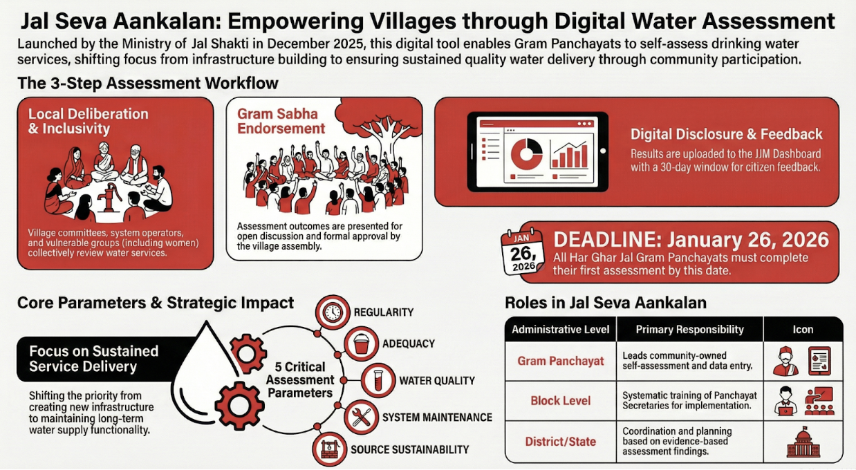 In December 2025, the Ministry of Jal Shakti (MoJS) launched Jal Seva Aankalan, a digital self-assessment tool designed to monitor the functionality of drinking water services in rural India. Developed by the Department of Drinking Water and Sanitation (DDWS) and integrated into the Jal Jeevan Mission (JJM) portal, the tool marks a strategic pivot from infrastructure construction to the long-term sustainability of water service delivery. By placing Gram Panchayats (GPs) and local communities at the center of the evaluation process, the initiative aims to institutionalize community stewardship, enhance transparency, and ensure that "Har Ghar Jal" (HCJ) villages maintain a consistent, high-quality water supply. All HGJ Gram Panchayats are mandated to complete this assessment by January 26, 2026.