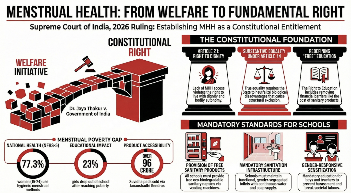 In the landmark case of Dr. Jaya Thakur v. Government of India & Ors. (2026), the Supreme Court of India officially recognized Menstrual Health and Hygiene (MHH) as a fundamental right under Article 21 (Right to Life and Dignity) and Article 14 (Right to Equality). This ruling transitions menstrual health from a welfare-based policy concern to a binding constitutional entitlement.